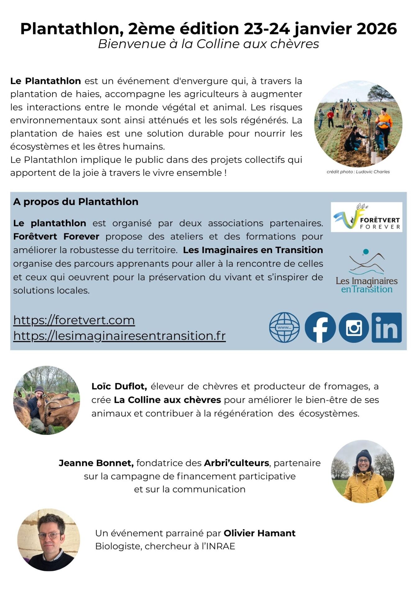 Le plan­tath­lon est orga­nisé par deux asso­cia­tions parte­naires. Forêt­vert Fore­ver propose des ateliers et des forma­tions pour amélio­rer la robus­tesse du terri­toire. Les Imagi­naires en Tran­si­tion orga­nise des parcours appre­nants pour aller à la rencontre de celles et ceux qui œuvrent pour la préser­va­tion du vivant et s’ins­pi­rer de solu­tions locales.