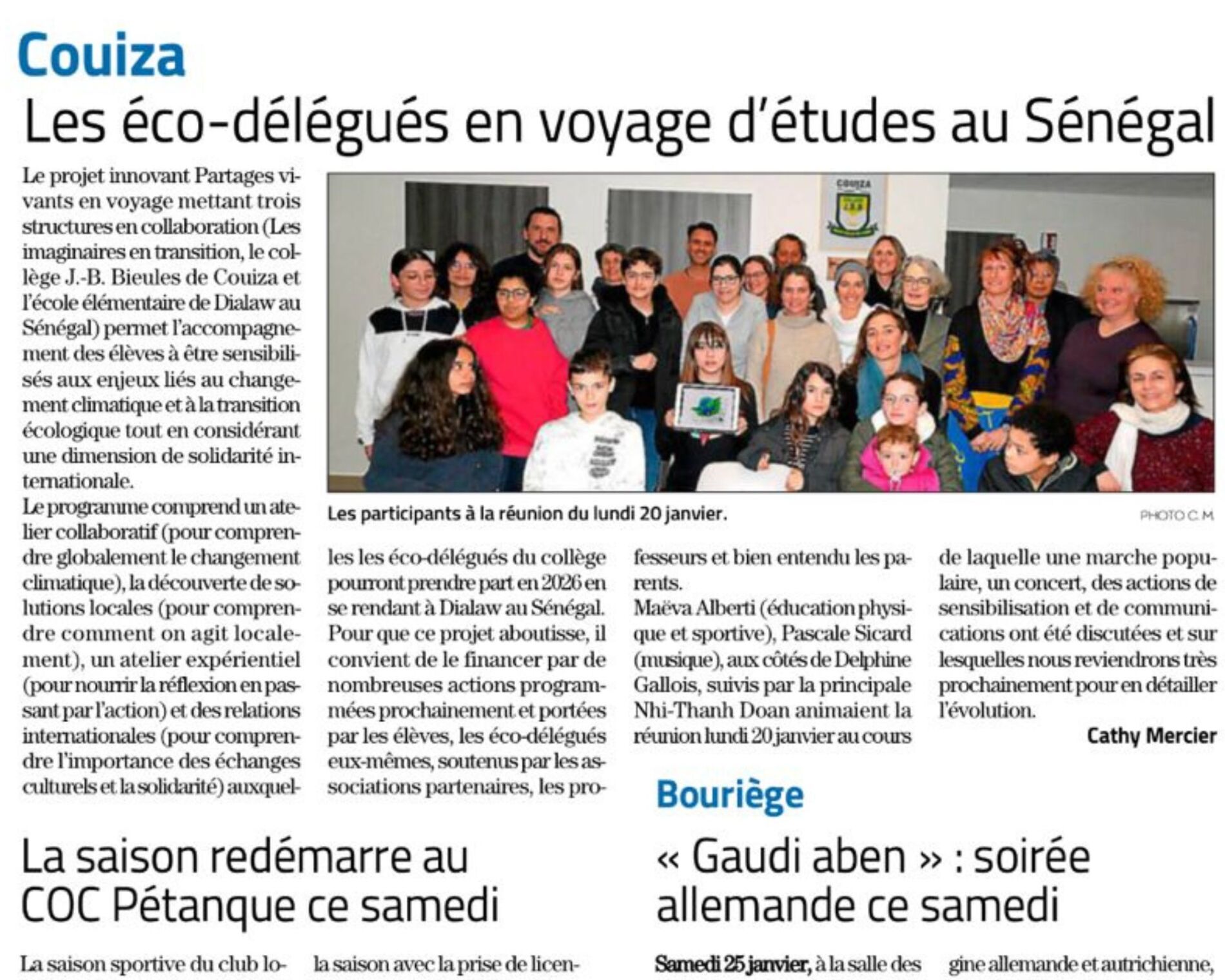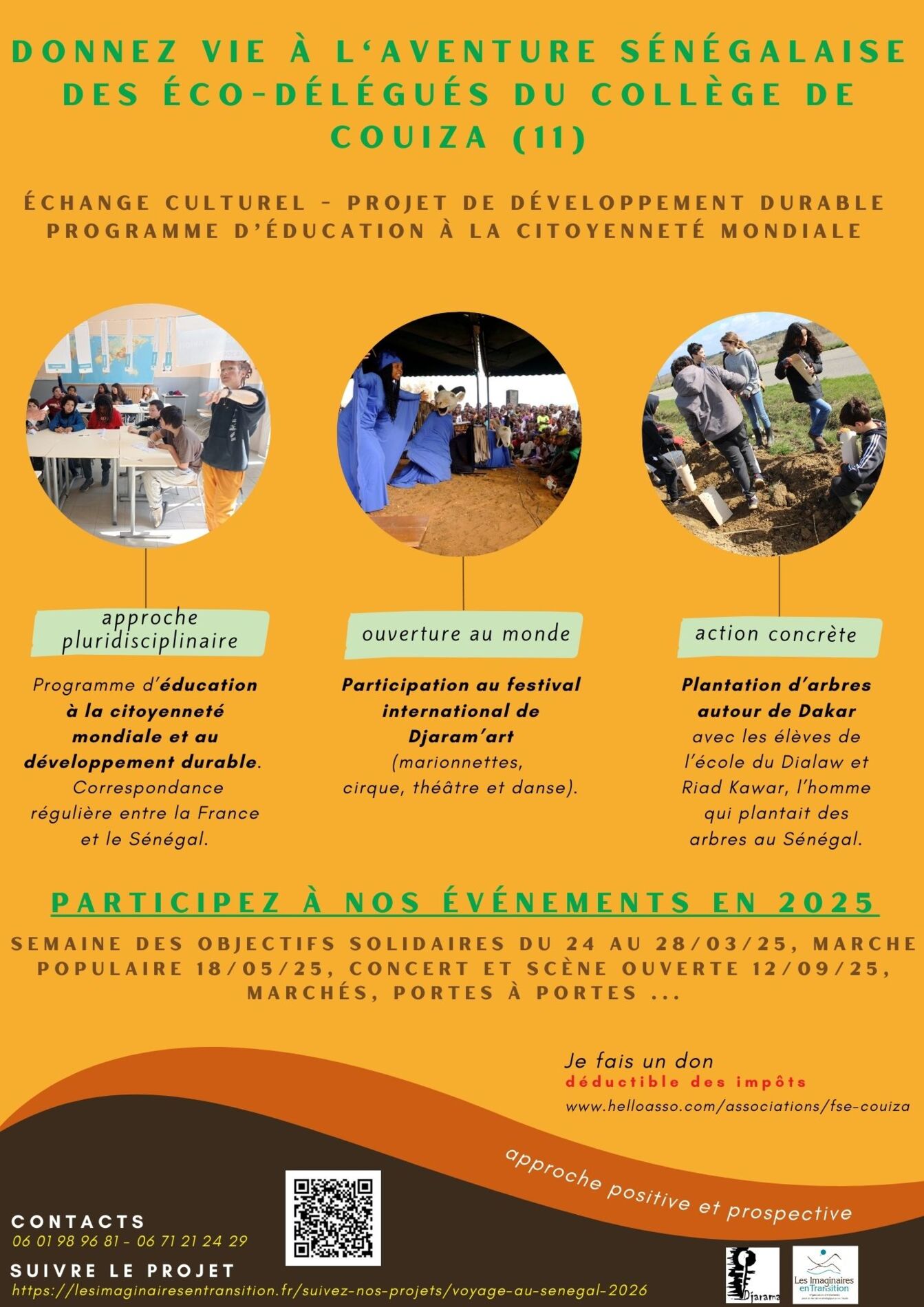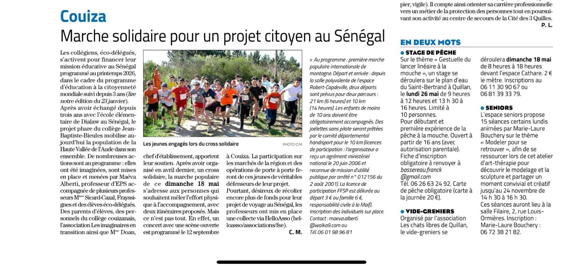Dans le cadre d'une correspondance régulière depuis trois ans entre Mme Maéva Alberti, professeure d'EPS, ses élèves du Collège de Couiza, ainsi qu'à travers des projets transversaux d'éducation à la citoyenneté mondiale menés chaque année via les Tandems Solidaires que nous accompagnons, un projet de voyage au Sénégal voit le jour et sera réalisé au printemps 2026 pour rencontrer les élèves de l'école de Dialaw.